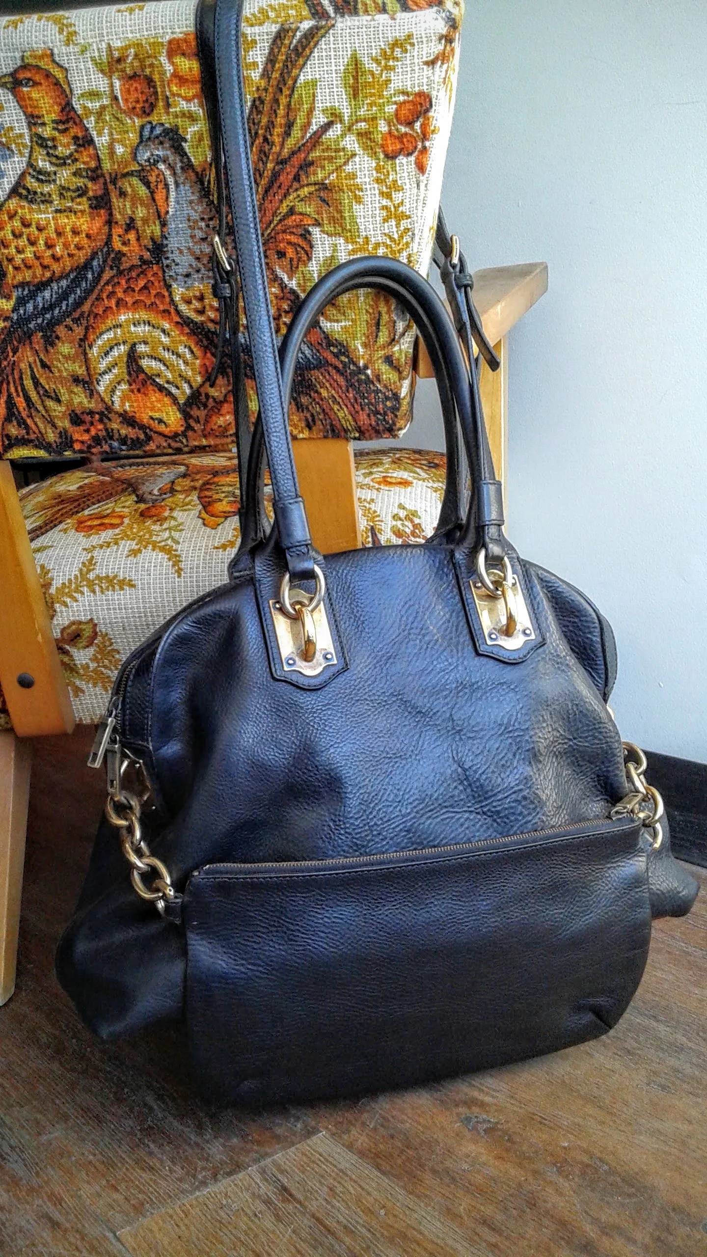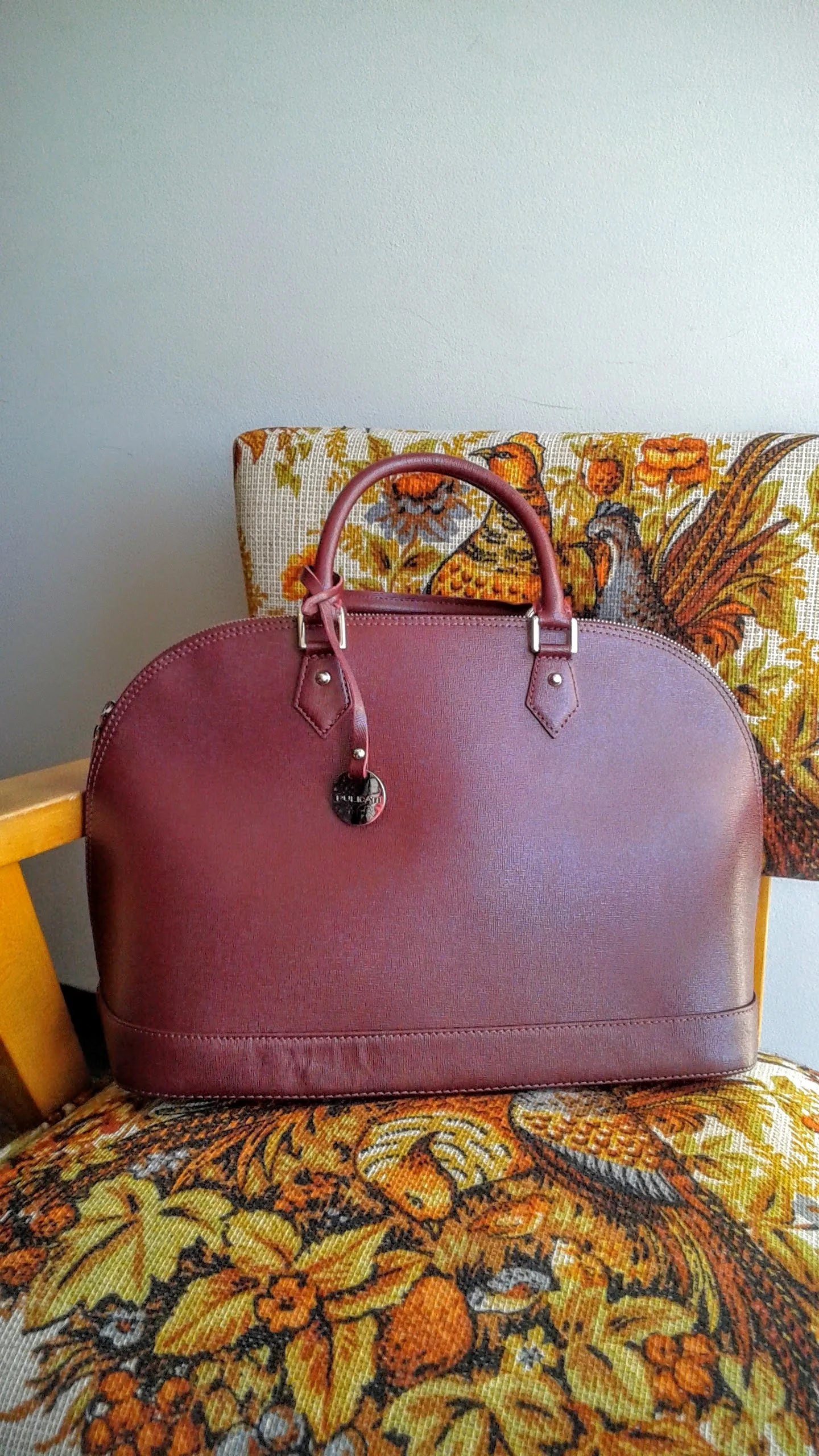 Also Italian: this beautiful maroon Pulicati hand bag! Not only is this purse stunningly beautiful in its simplicity, but it hits two important points for me: stands on its own, and has little metal feet! This high-end purse is perfection!