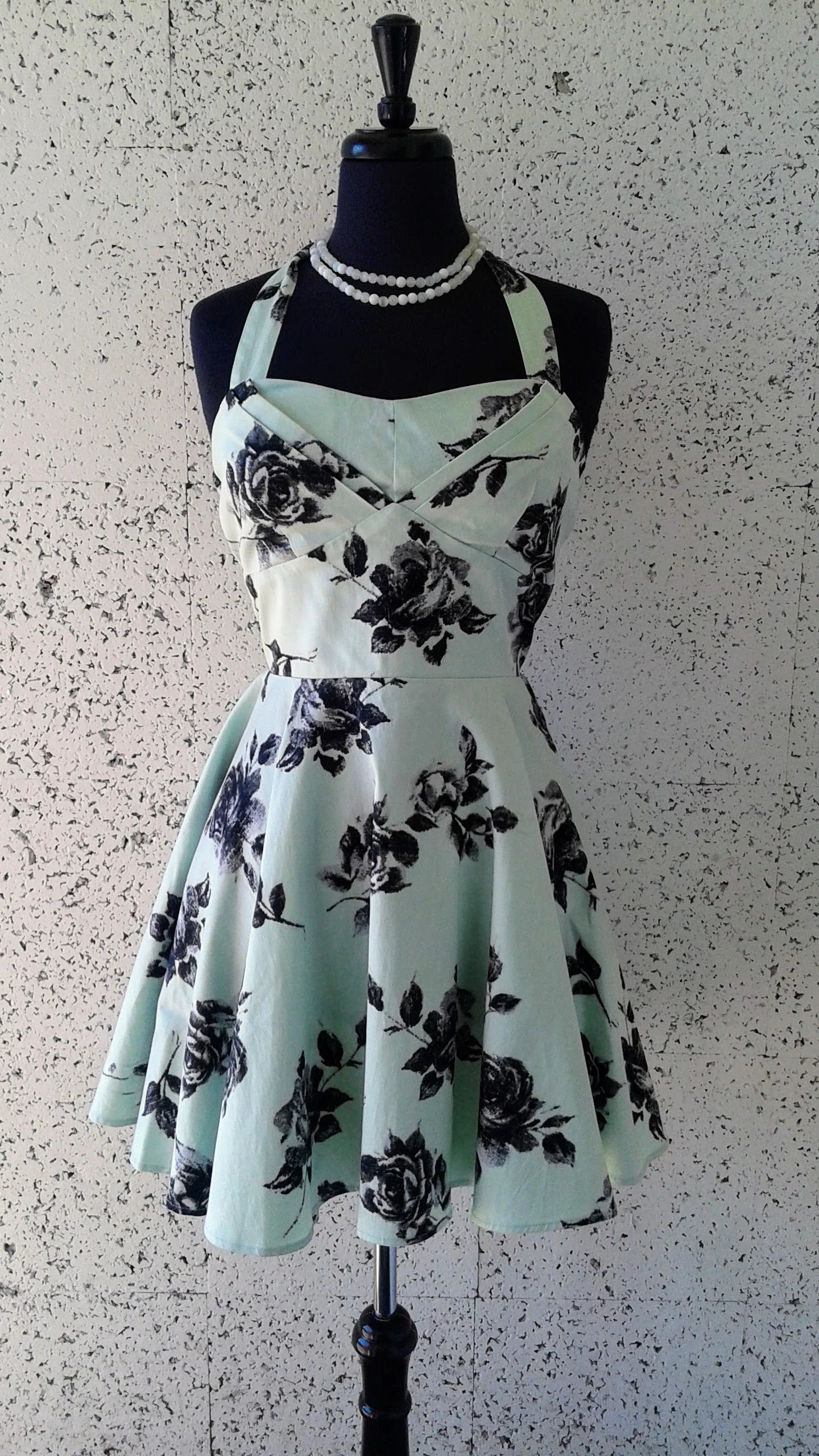 First let's start with the eye-poppers! This dress comes to us all the way from Portland. I love the dusty, black and grey floral, and friends who are busty will appreciate the extra panel in the halter top!