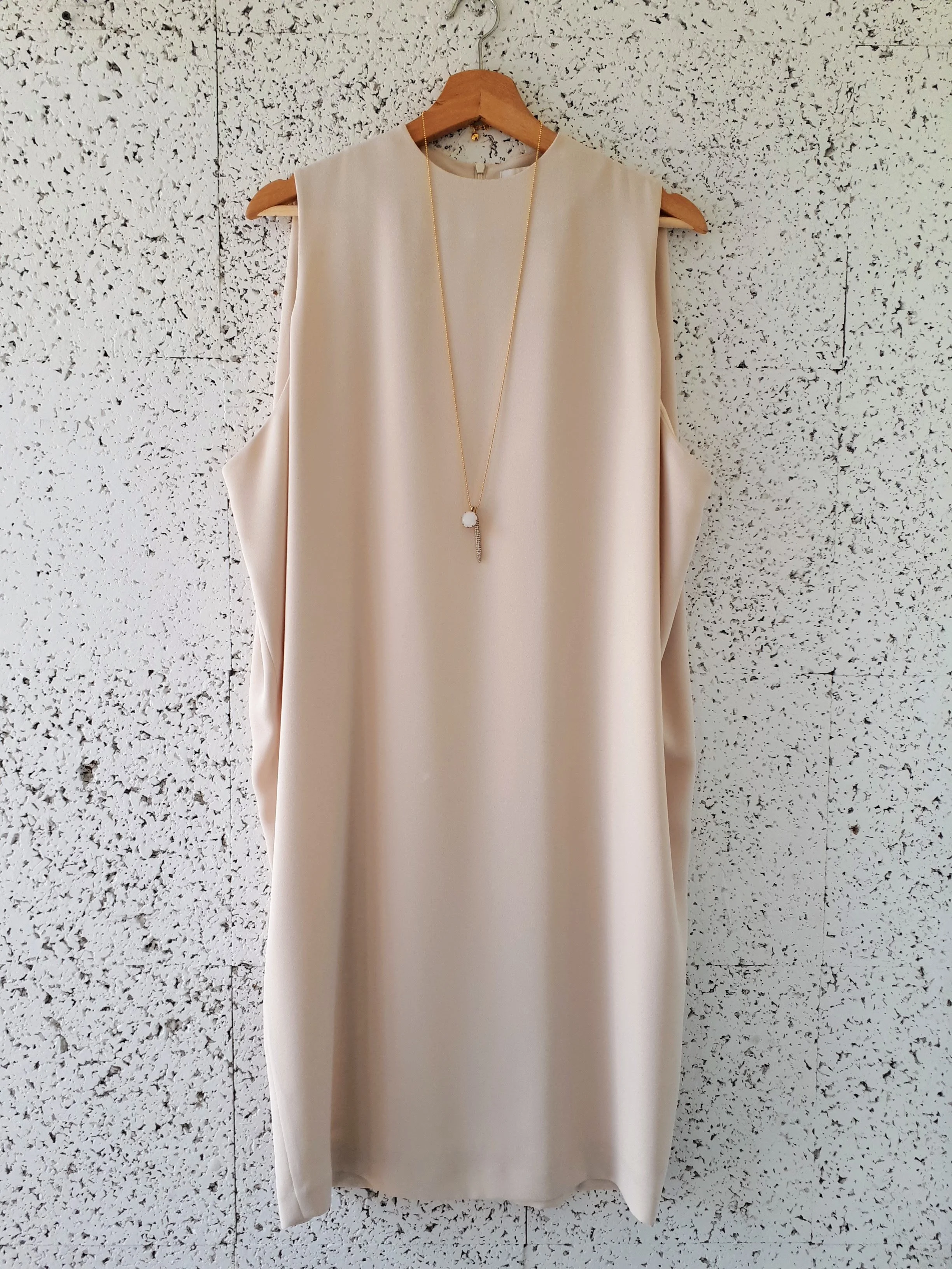 There is some great juxtaposition happening with this peach dress here. It's has a casual summer feel with its boxy shape and drawstring waist.....